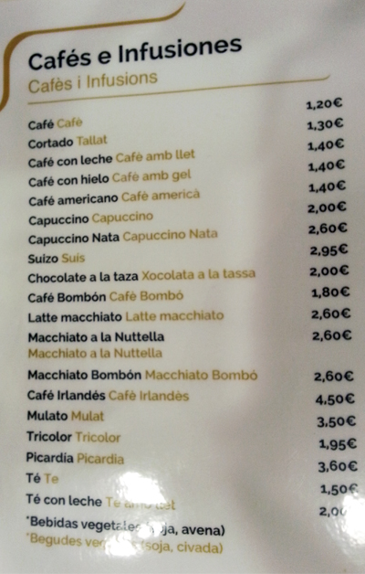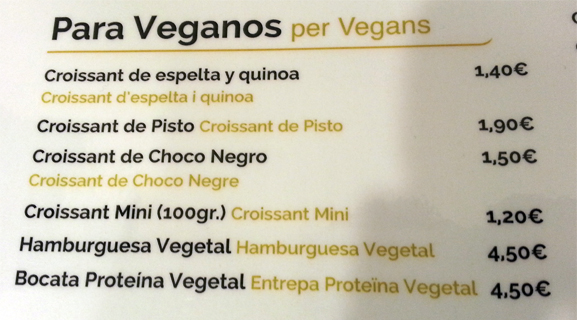 La cafetería CroisSants, en el número 36 de la Carretera de Sants (Barcelona), de la que ya os hablé en la entrada de Cruasanes veganos, ofrece, además de ricos cruasanes pequeños -son mi perdición, lo confieso-, otros cruasanes y bocadillos que podéis ver en la carta adjunta. También tienen empanadas rellenas de verduras y otras de maíz.