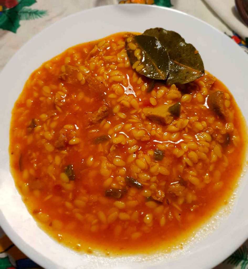 ➂ Cuando ya está sofrito, echa los gurullos y añade agua (que los cubra) y sal. Cuando rompa a hervir, añade un poco de azafrán y un par de hojas de laurel.