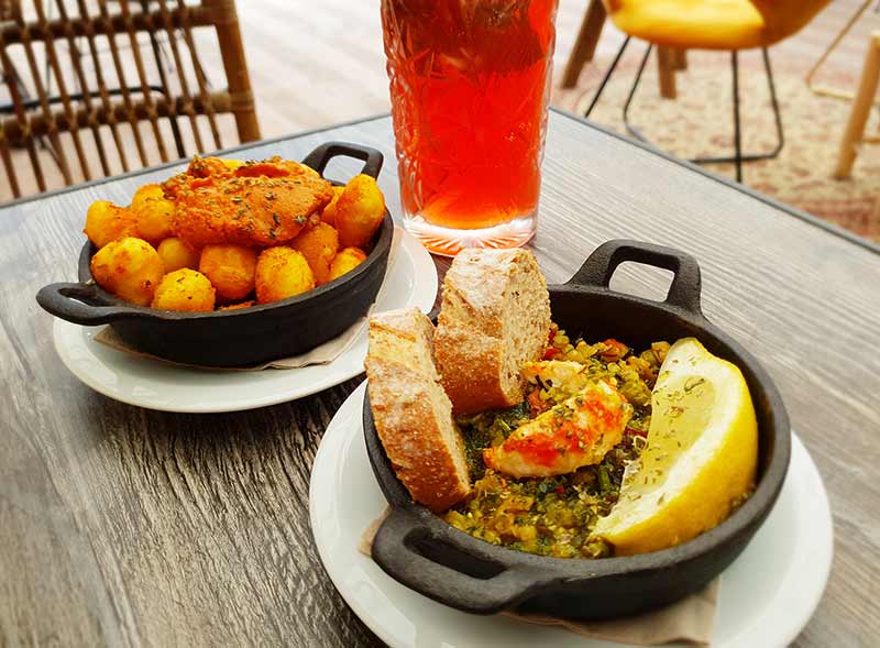 Encontrar Bubita Bar bajo el ardiente sol del verano fue una maravilla. Opté por la mini paella con falsa gamba y limón, gnocchis fritos al pesto rojo, un plato típico del sur de Italia que sirven catalanizado con salsa romesco, y la ensalada Mamma Mia -rúcula, tiras de calabacín, pesto de tomate seco marinado -con aceite de oliva, orégano, romero y ajo-, parmesano vegano y albahaca. Y de postre, la rica tarta Bubita, elaborada con un bizcocho de chocolate deconstruido cubierto con helado de vainilla.